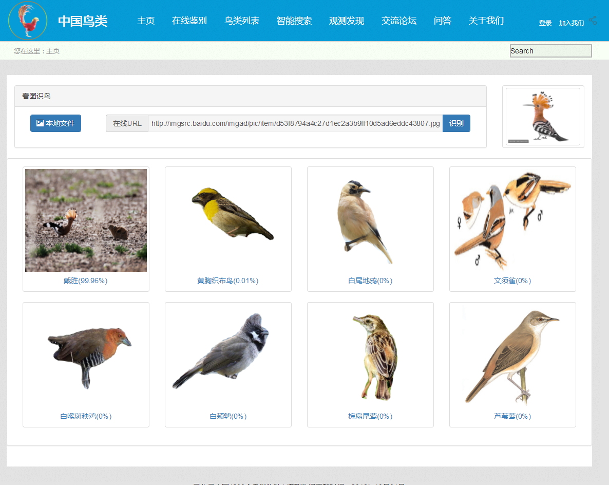 由NSII资助完成的中国野生鸟类图像鉴别有两种方式:1)在线鉴别;2)上传本地图片鉴别