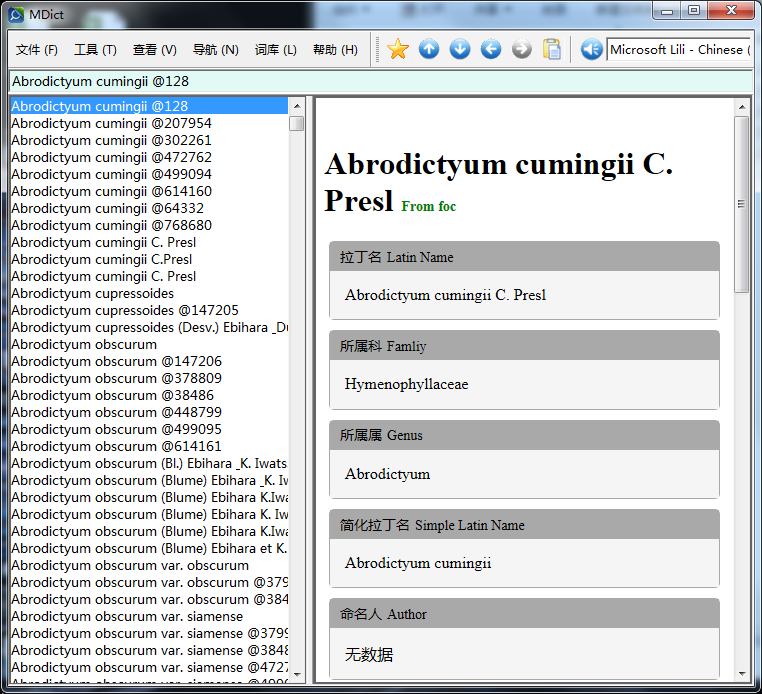 现代物种信息数据库是开展生物多样性资源研究和保护的重要依据。数年来,国内外权威机构建立了多个物种信息数据库。为了帮助植物工作者和爱好者更全面的了解我国植物物种资源,国家标本资源共享平台(National Specimen Information Infrastructure, NSII)清理整合了国内分布的、长期引种栽植并已归化的植物物种名称,开发了《植物词典》安卓APP版和PC版。截止目前,植物词典收录的植物种名称总量为776543条(不同数据库间有重复)。 数据来自8个权威数据库:Species 2000中国节点、Flora of China、中国植物志、The International Plant Names Index、Tropicos、The Plant List、Catalogue of Life和Encyclopedia Of Life。 植物词典安卓APP版提供了三种查询数据的方式,包括精确查询、模糊查询和半模糊查询,提供拉丁名、中文名和异名等关键词搜索,并可以在线访问数据来源。除此之外,词典还具自动补全、收藏物种名称、通过异名访问接受名、并提供去除了命名人的学名再查询、拷贝词条详情等实用功能。 植物词典PC版提供了Mdict词典词库,其中收录词条1386116个,物种描述信息83772条,图片40490张。支持拉丁名和中文名检索、关联词条的跳转、访问数据源网页等功能。